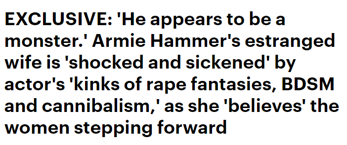 连续三天,推特上和ins上的影迷都处于炸锅状态。因为1月11日,外网突然有几个账号爆料《以你的名字呼唤我》的男主角之一armie hammer(外号“锤子”“艾米锤”),喜欢性虐,喝人血,甚至是一名食人族...