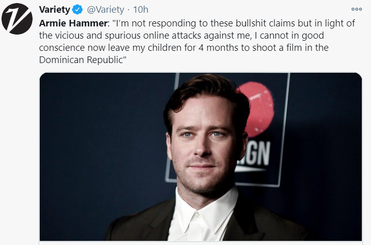 直到这事情已经发酵了三天三夜,被爆料的当事人艾米锤才打破沉默。他的声明整体比较轻描淡写,他说:“我不会回应那些狗屁说法,但鉴于网上对我的恶意和虚假的攻击,我现在不能昧着良心离开我的孩子们,在多米尼加共和国进行为期4个月的电影拍摄。”