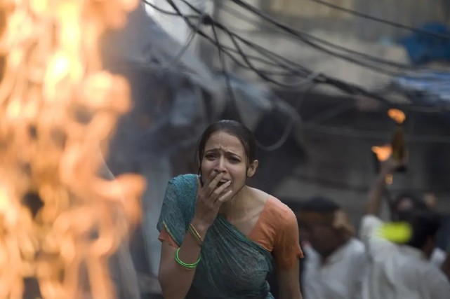 给我印象最深刻的,是主持人提出的第三个宗教问题:印度教义中描述的罗摩神,他的右手里握着的是什么?这时候,电影画面折射的,正是杰玛幼时,母亲的死,死于穆斯林和其他宗教拥护者的杀戮中。当那些狂热的教徒拿着木棒一下下敲在这些无辜的平民身上的时候,罗摩神右手握着的东西,就正好是杰玛心里永远无法磨灭的印记:弓和箭。