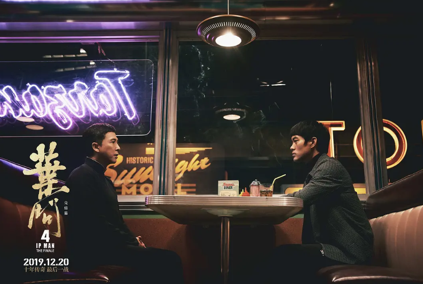 而这个过程,《叶问4》里表现得非常连贯。我们看到了叶问来到旧金山伊始,因为徒弟李小龙教授外国人中国功夫而遭到唐人街中华总会势力的排挤,但是面对美国军方的欺压,大家又尽释前嫌团结起来一致对外。