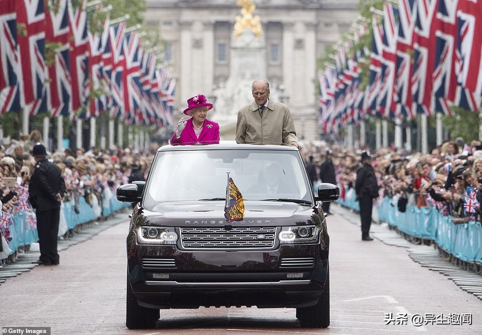 29.伊丽莎白二世女王和菲利普亲王从他们的揽胜车顶上探出头来,向在购物中心排队的数千名宾客挥手致意。