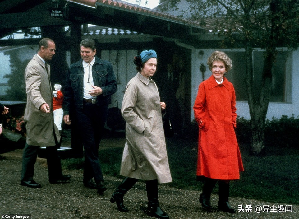 41.1983 年,在访问加利福尼亚期间,女王与菲利普亲王、罗纳德·里根总统和南希·里根一起散步。