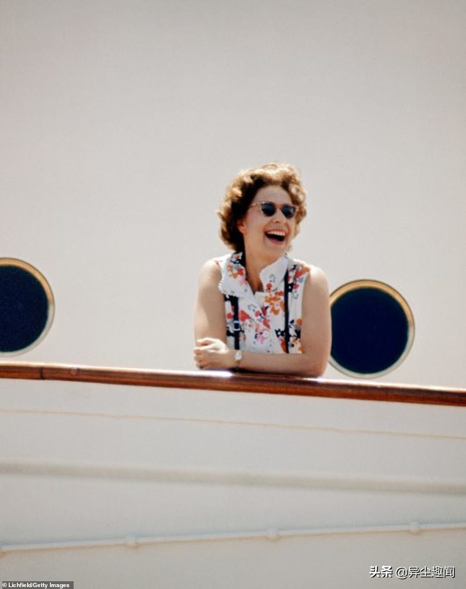 21.1971 年,女王穿着无袖连衣裙、戴着太阳镜,露出灿烂的笑容。