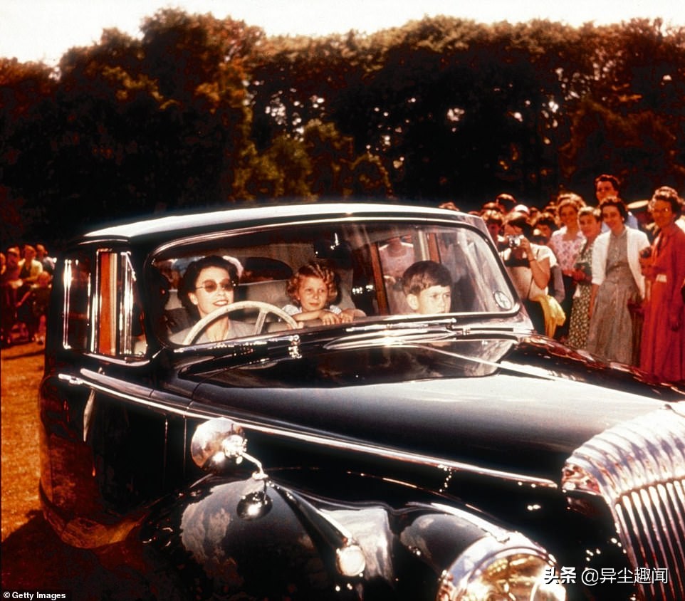 23. 31 岁的女王驾驶着戴姆勒轿车,年轻的查尔斯王子和安妮公主作为乘客。