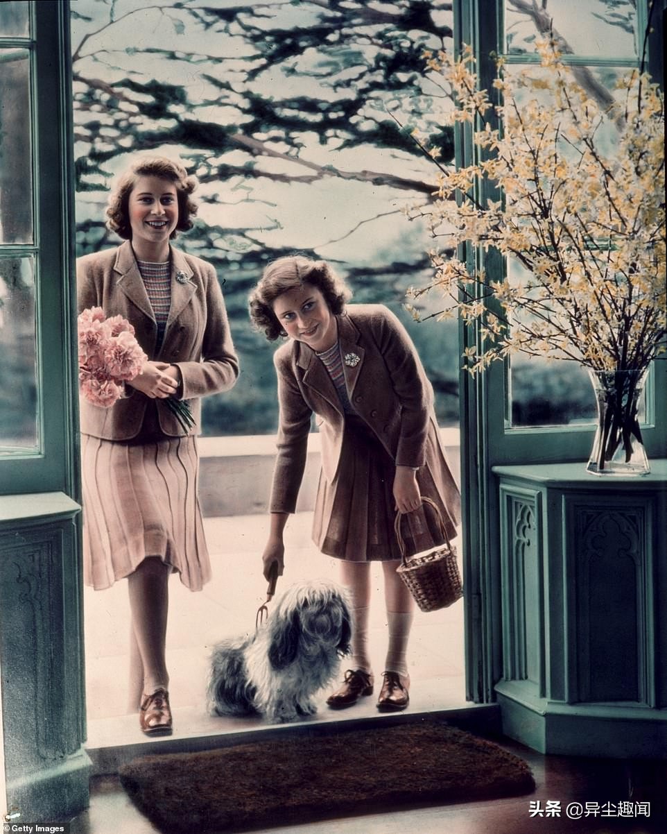 69.1942 年,年轻的伊丽莎白公主带着一束鲜花与她的妹妹玛格丽特散步回来。
