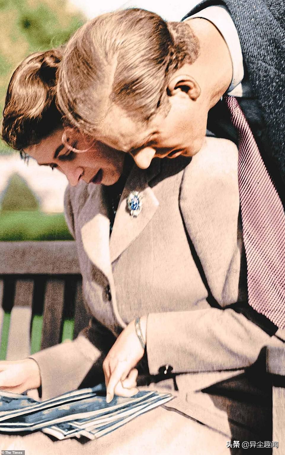 33.伊丽莎白公主(那时还不是女王)和爱丁堡公爵在 1947 年度蜜月时在看他们的结婚照。