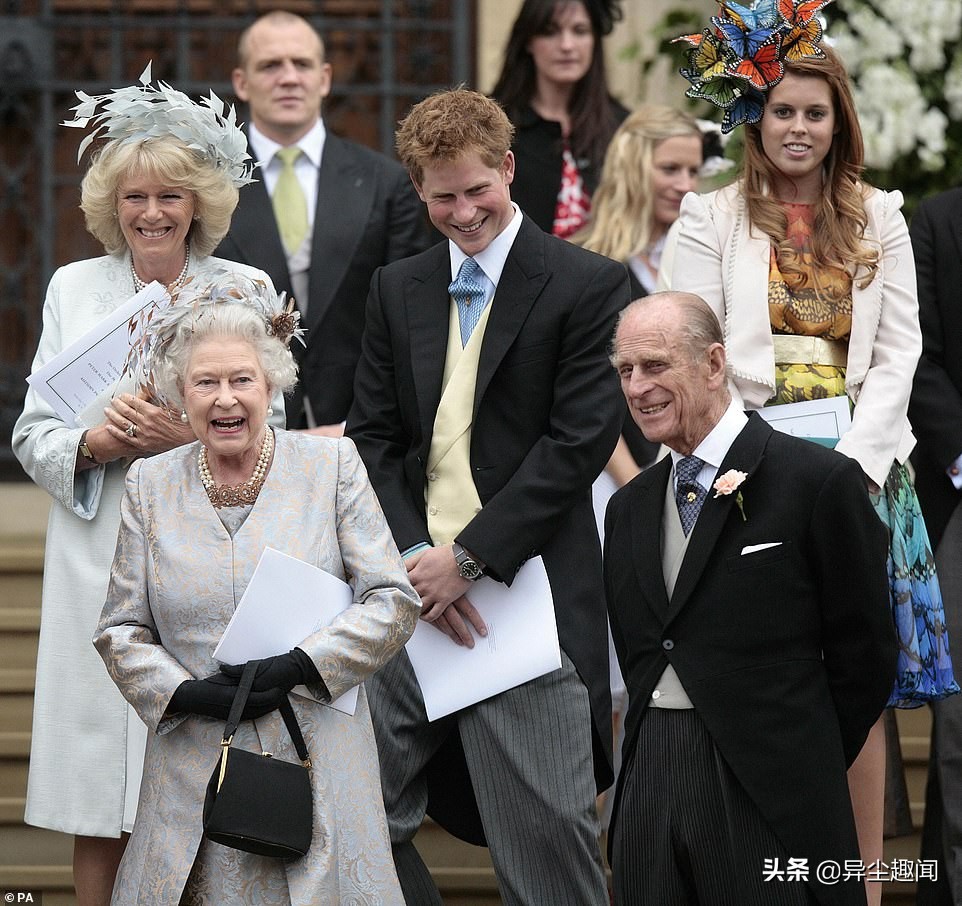 35.伊丽莎白二世女王、卡米拉、迈克廷德尔、哈里王子、扎拉菲利普斯、爱丁堡公爵和比阿特丽斯公主在参加彼得菲利普斯的婚礼后离开温莎的圣乔治教堂。