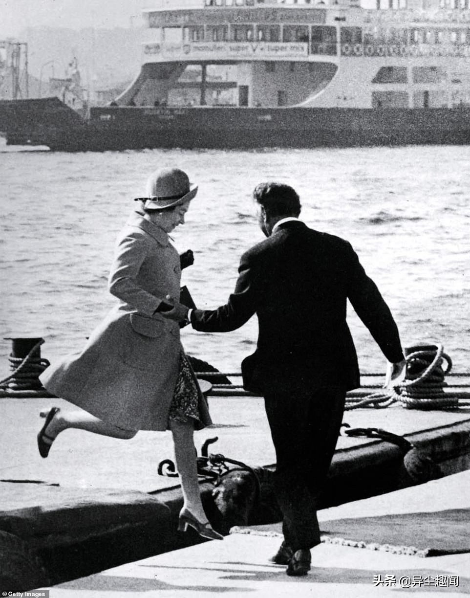 6.1971 年,在对土耳其进行国事访问期间,英国女王伊丽莎白二世从皇家游艇“不列颠尼亚”号下船后从驳船上跳上岸。
