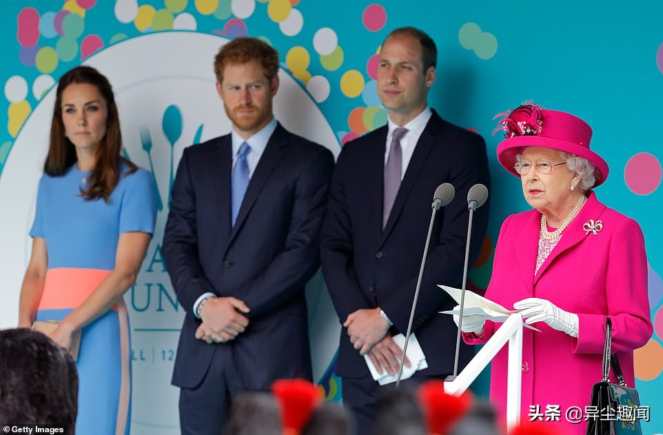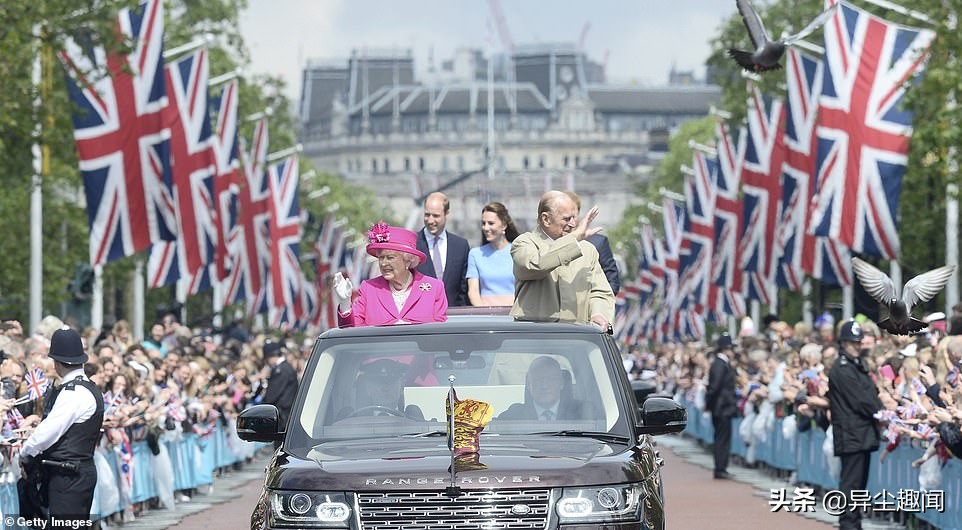 38.2016 年,女王、菲利普亲王、威廉王子和凯特米德尔顿向皇室粉丝挥手致意。