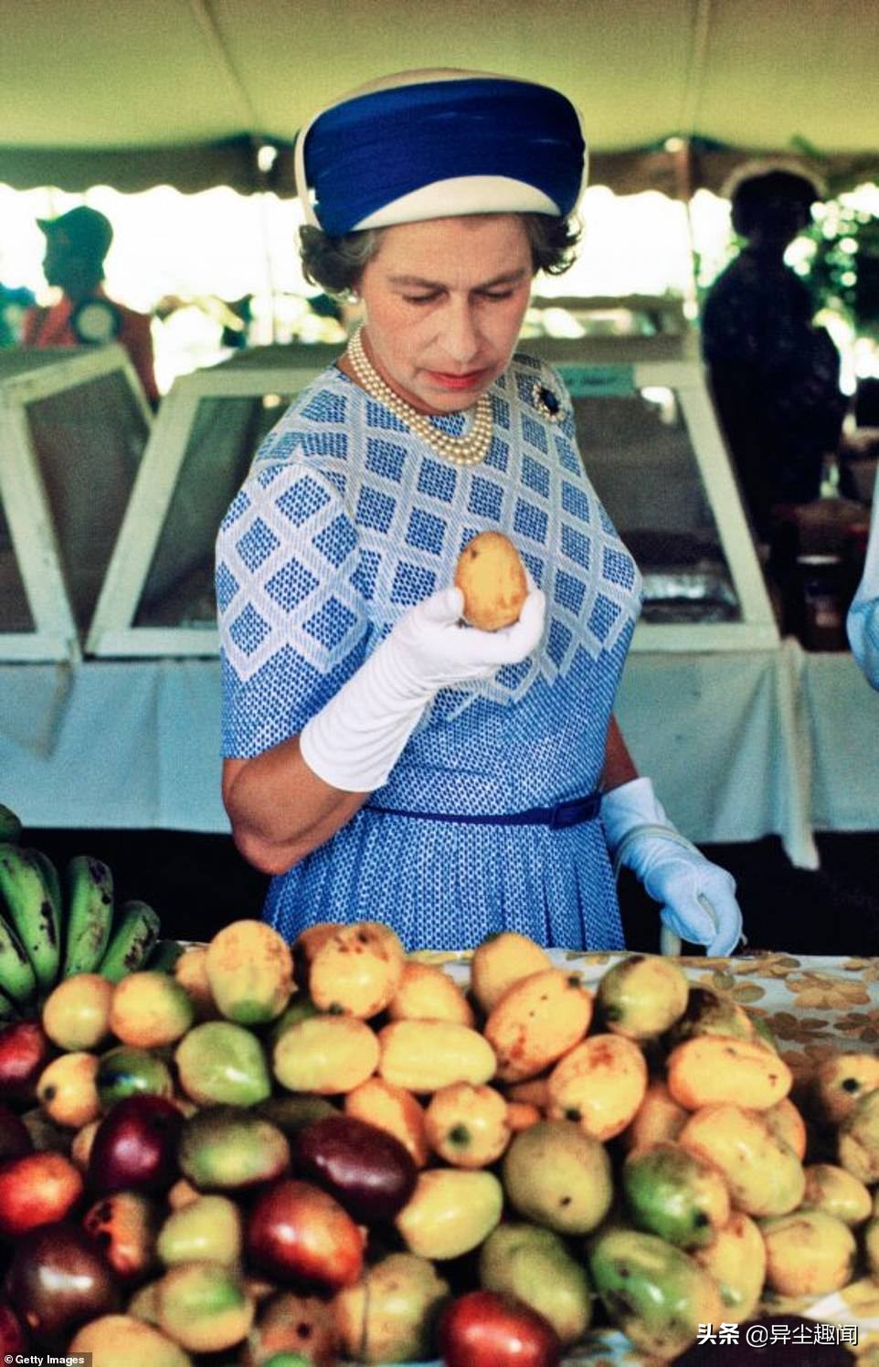 9.1977 年 10 月,伊丽莎白女王在参观英属维尔京群岛的一个市场时检查芒果。