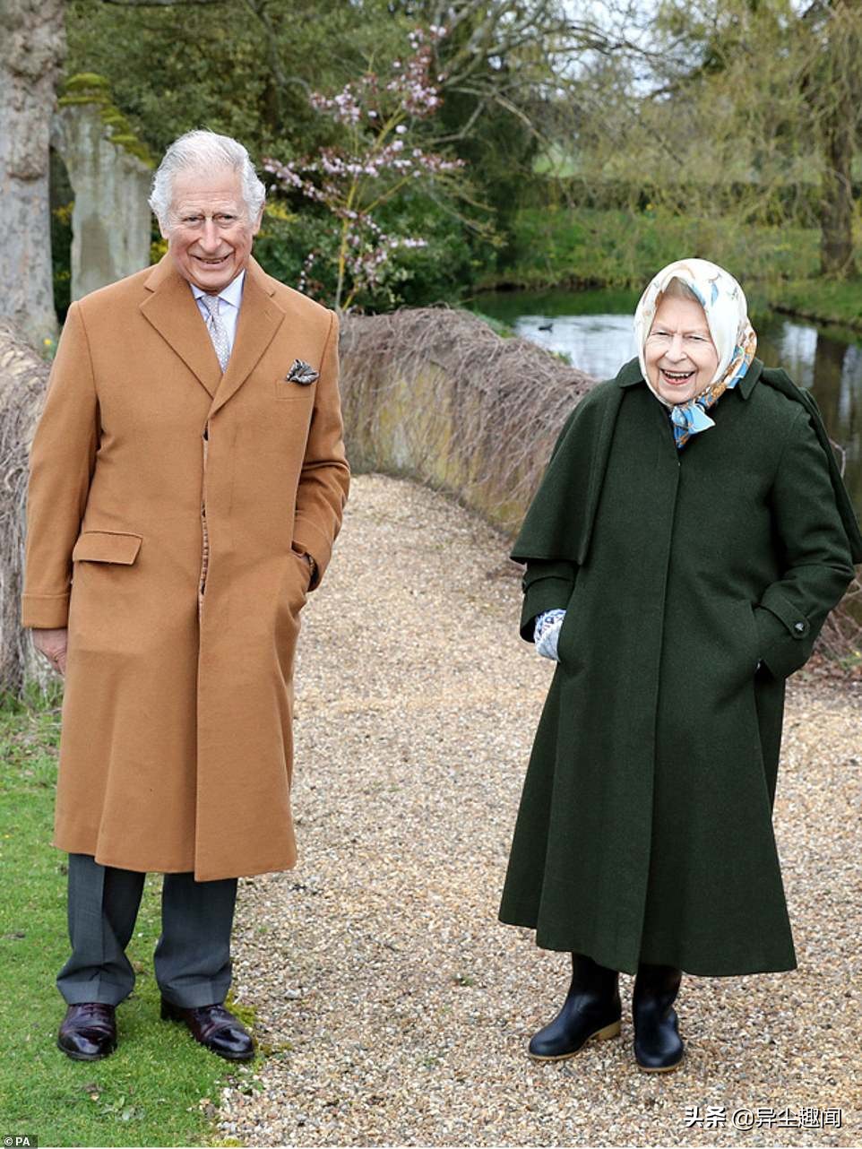 46.2021 年,伊丽莎白女王和查尔斯王子在温莎花园里散步。