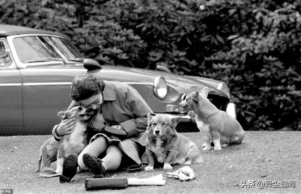17.1973 年,伊丽莎白女王和她的三只柯基犬坐在草地上,自从 1952 年成为英联邦女王以来,女王拥有 30 多只柯基犬。