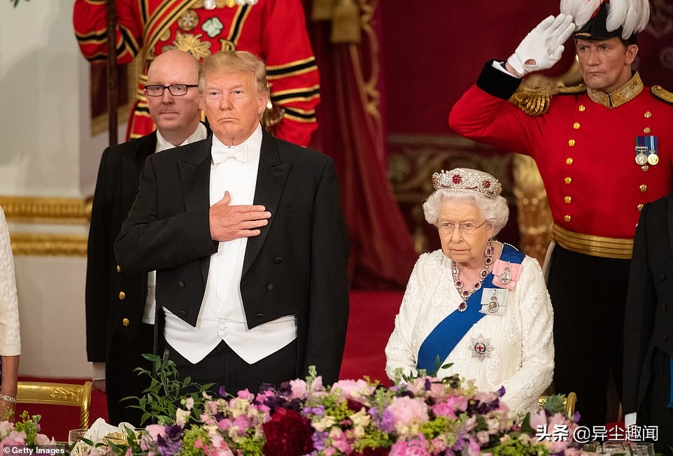66.2019 年,在白金汉宫举行的国宴上,女王站在唐纳德·特朗普总统旁边时看起来非常严肃。