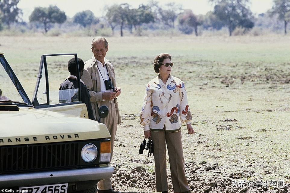 71.1979 年,在对赞比亚进行国事访问期间,伊丽莎白女王与菲利普亲王一起在野生动物园中欣赏风景。
