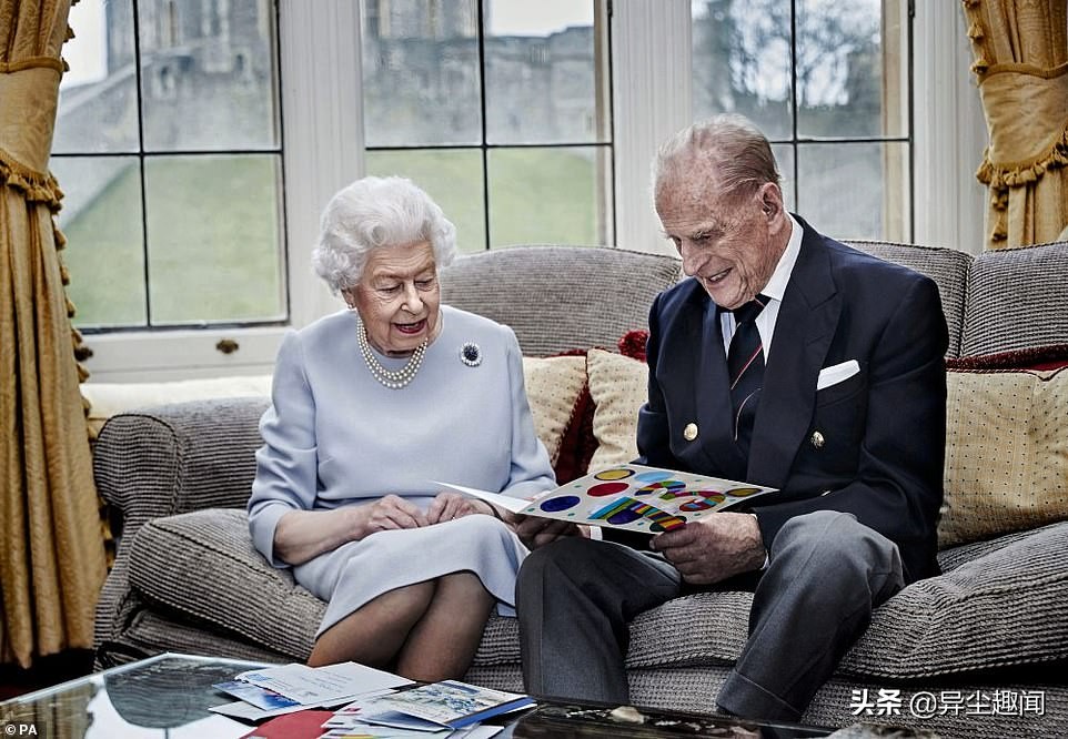 34.2020年,女王和她的丈夫欣赏了他们的曾孙乔治王子、夏洛特公主和路易斯王子制作的纪念卡。