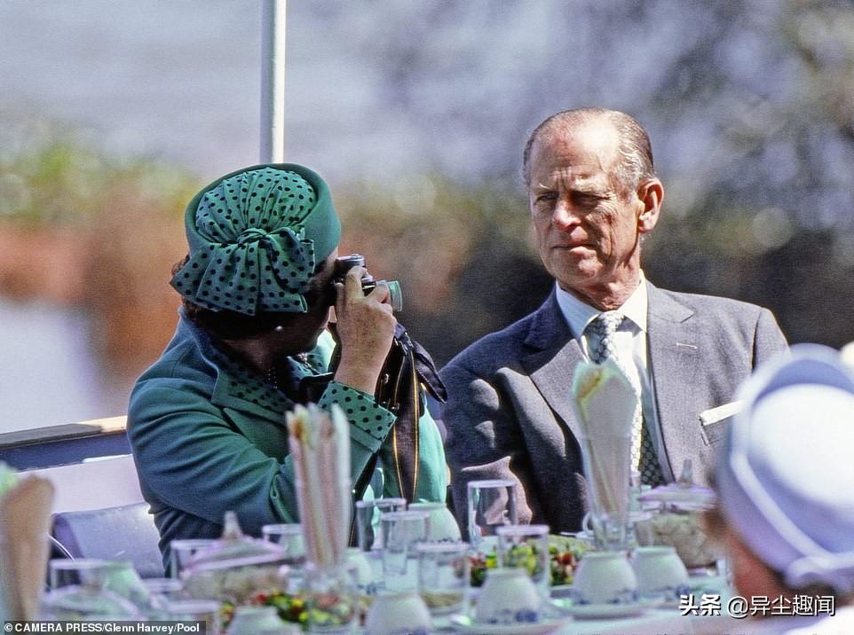 10.伊丽莎白女王 在1986 年访问中国乘船游览时为她丈夫菲利普亲王照相。