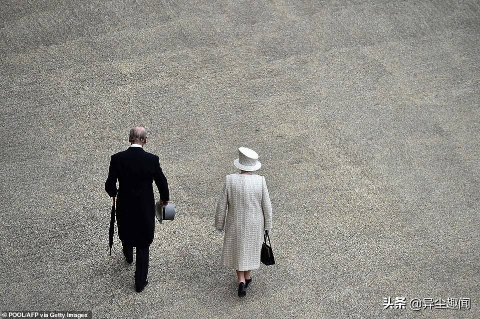 48.2015 年,女王和菲利普亲王在白金汉宫参加花园派对时并排走在一起。