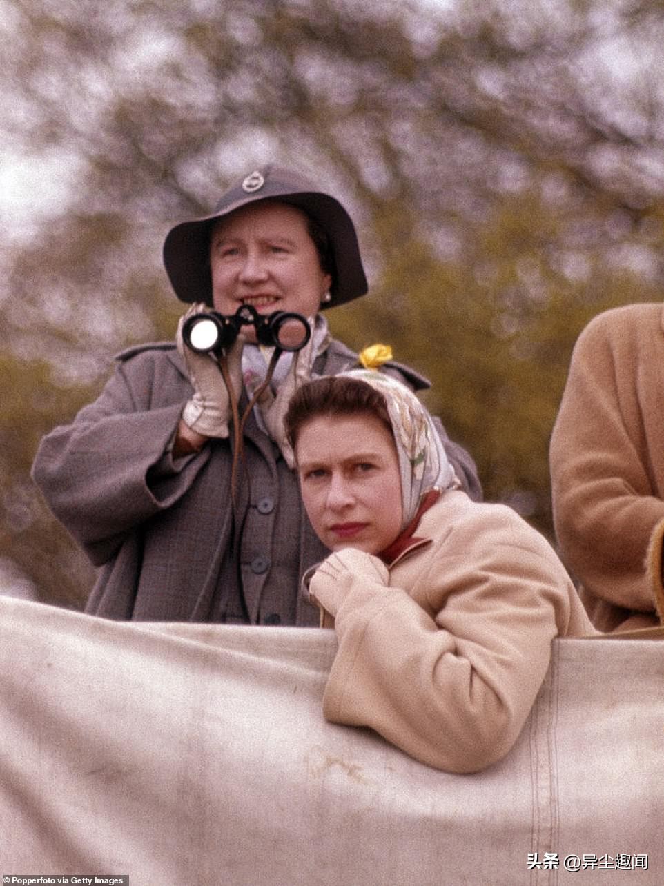 60.1957 年,伊丽莎白二世在与太后在观看赛马比赛中看起来非常严肃。