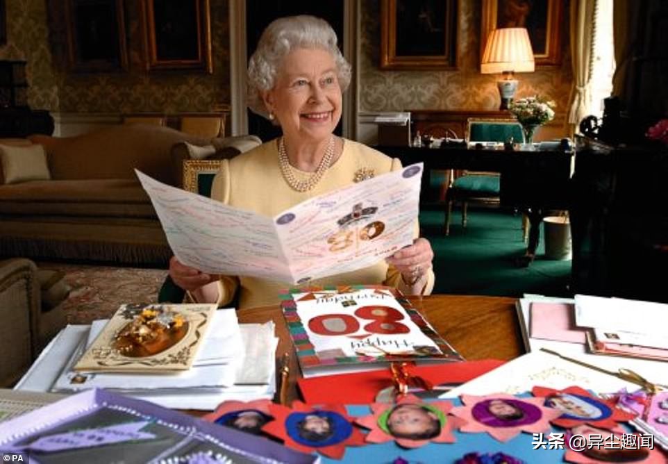 2.女王在她80岁生日时坐在伦敦白金汉宫的摄政室里,看着亲朋好友送给她的一些生日贺卡。