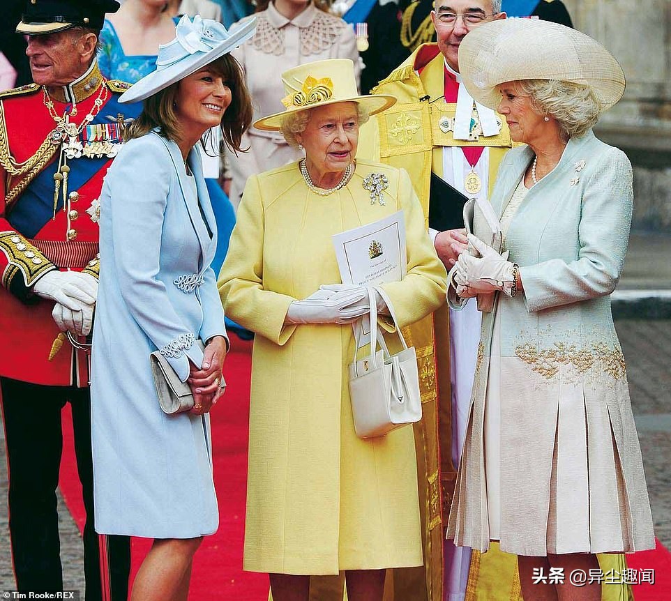 14.2011 年 4 月,在威廉王子的婚礼上,伊丽莎白二世女王身着淡黄色套装,与卡罗尔·米德尔顿(左)和康沃尔公爵夫人卡米拉(右)聊天。