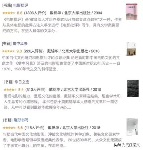 戴锦华教授在电影评论领域出了十余部专著,在网站上评分每本都8分以上,代表作《雾中风景》《电影批评》《隐形书写》《昨日之岛》等更是被译为英、法、德、意、西、日、韩文出版,无数电影业内人士和电影学子视为圭臬,每一本都值得细读。