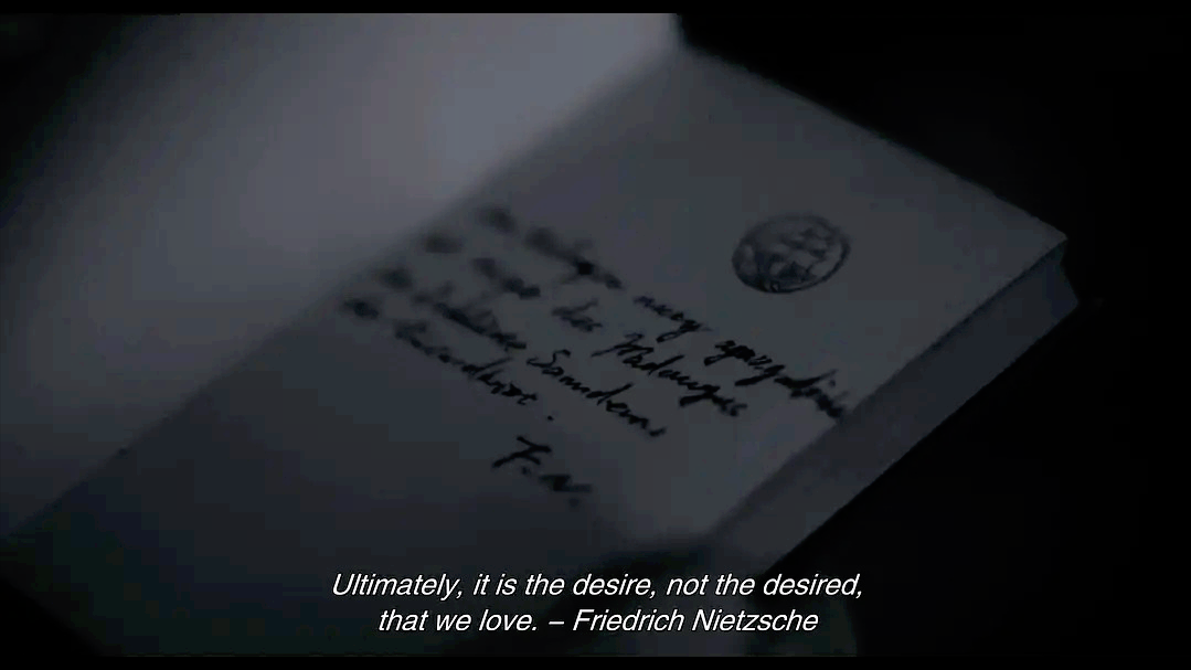 而片中出现的1774年版本的歌德所著的《少年维特之烦恼》,其上有尼采所写的一句话:“ultimately, it is the desire, not the desired,that we love.”