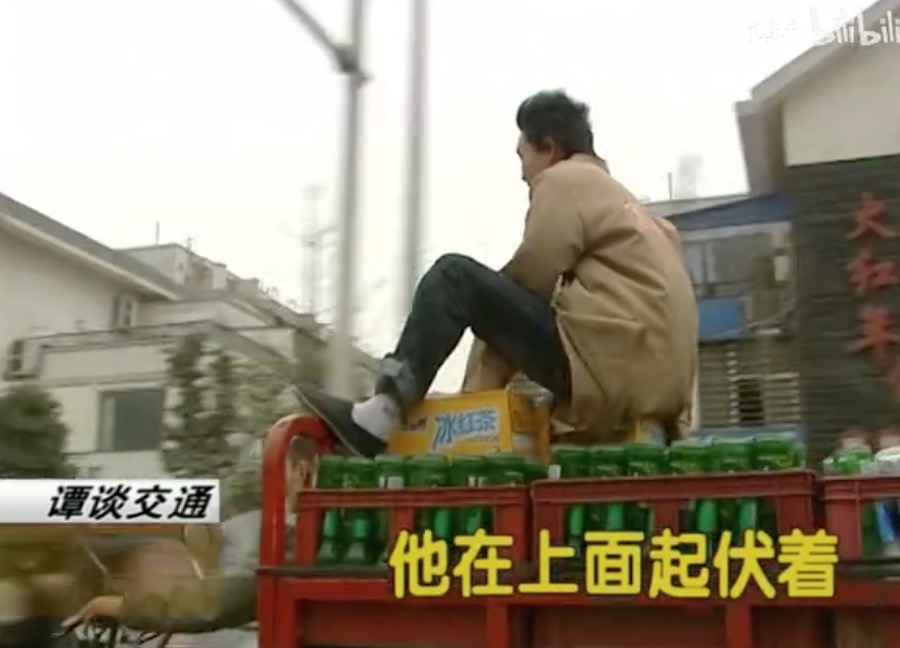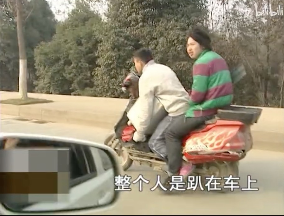 某天谭sir在马路上遇到有人骑着电动车载人,并且驾驶的姿势也是与众不同:人趴车头,不用双手。
