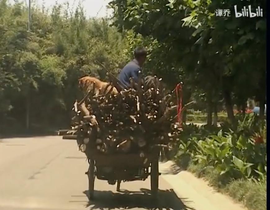 他要将车上的树枝拉去卖给工厂,这一车货就有七八百斤,赚来的钱可以供给一家人的生活。