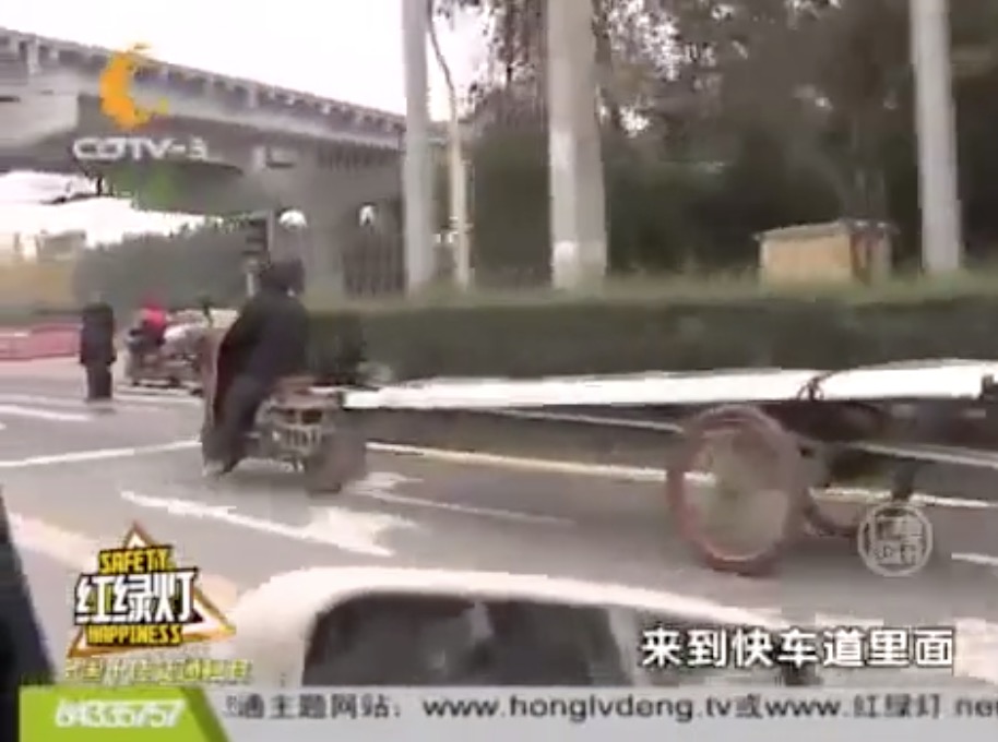 谭:你该走哪儿啊?(意思是该走非机动车道)