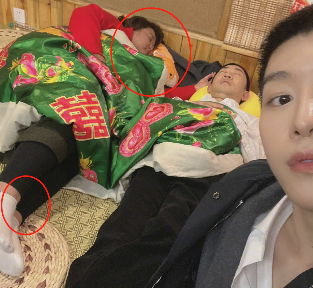 照片里,范丞丞站在镜头最前面举着手机偷拍,皮肤白皙五官出众。而贾玲和杨迪则睡在东北大通炕上,贾玲靠着卡通枕头头发凌乱,一只手放在杨迪头边,圆嘟嘟的脸睡得通红,袜子都把脚裸勒出一圈肉。