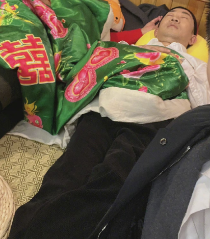 对比来说,杨迪睡姿较为规矩,双手交叉放在胸前,双腿并拢平顺躺着,像个乖巧的小男孩。两人盖着大花棉被,正在酣睡中。