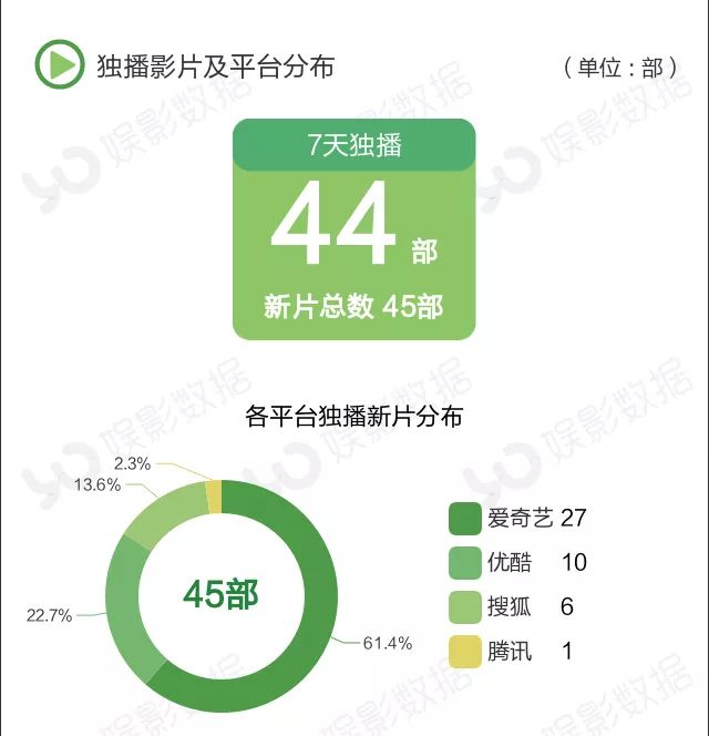 本周上新影片数45部,较上周增加7部,其中44部为独播片。