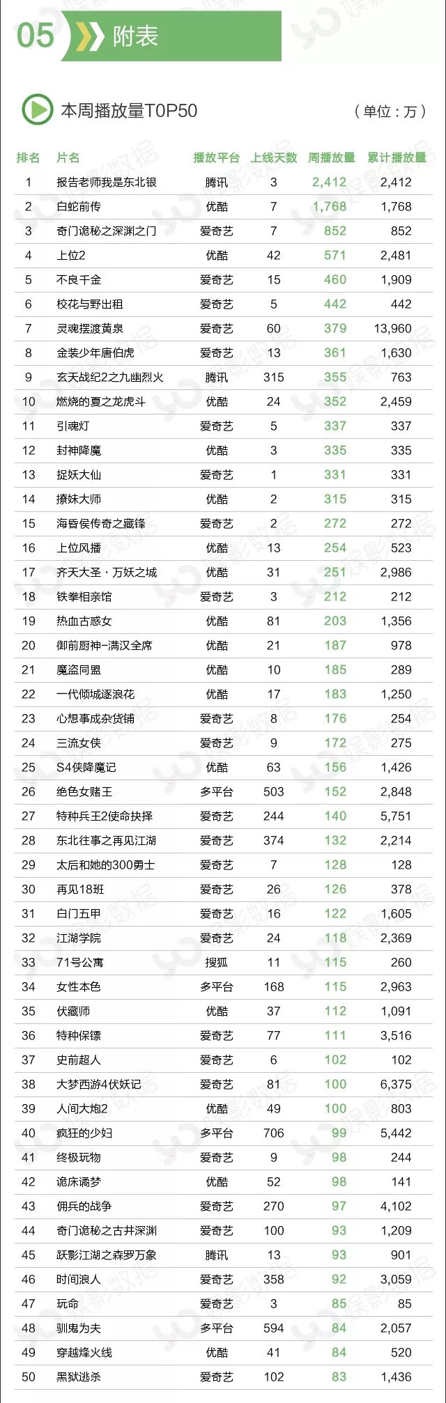 本周排名前十的网大中,有5部是在爱奇艺独播,优酷3部,腾讯2部。