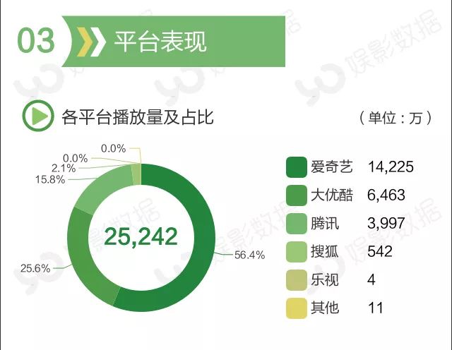 平台表现方面,前三排序与上周一致,但占比份额发生了一定的变化。爱奇艺仍排名第一,占比56.4%,较上周份额下降10.7%;大优酷第二,占比25.6%;腾讯第三,占比15.8%。本周,大优酷与腾讯占比份额皆有小幅度上升,与爱奇艺差距进一步缩小。