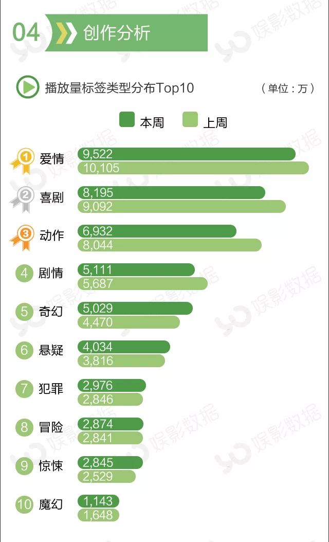 本周观众最喜欢的类型片与上周稍有变化,前三名分别是爱情、喜剧、动作。冒险新进榜单排名第八;惊悚、魔幻较上周上升一位;武侠跌出周top10类型排名。