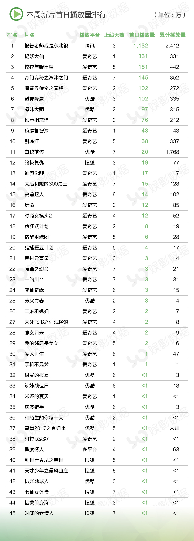 本周新片表现不错,top10中有四部新片,并且占据了周榜的前三名。腾讯视频本周强势夺冠,由郑恺创办的小猎豹传媒出品的青春喜剧电影《报告老师我是东北银》上线3天,点击量2412万。