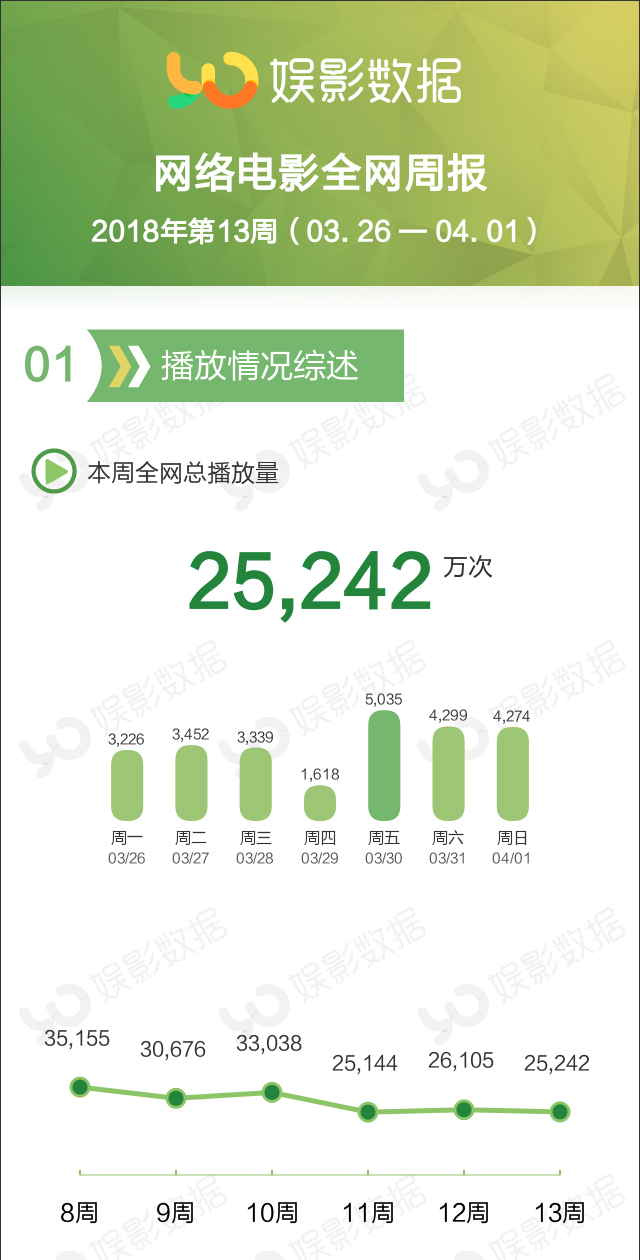 2018年第十三周(3月26日至4月1日)网络电影的全网播放量2.52亿次,较上周下降3.3%。其中周五(3月30日)播放量最高,达5035万。周四(3月29日)播放量最低,为1618万。