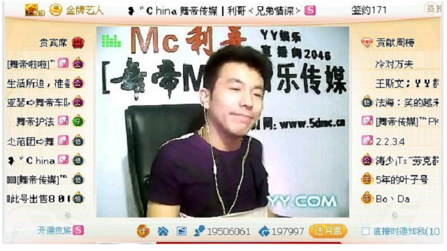 mc利哥,原529旗下艺人,现在签约china传媒,也是china传媒的核心人物,同时也是武帝传媒的创始人,2013年yy年度盛典最佳男金牌艺人。据说他在yy平台上一年收益就能达到300多万。