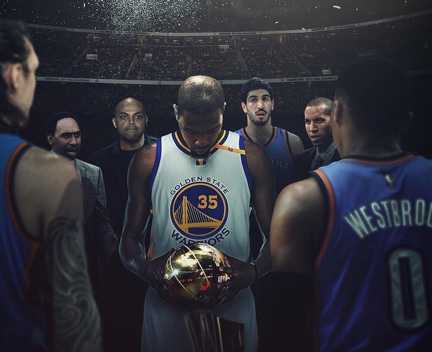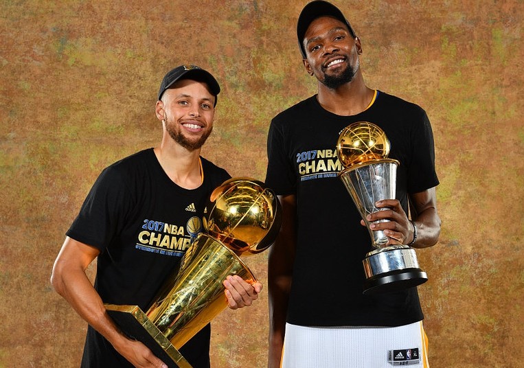 于是拥有了杜兰特的勇士变得天下无敌,他们在季后赛以12连胜的记录晋级总决赛,面对拥有三巨头的骑士,勇士也是完全吊打骑士,杜兰特变身死神,无情的只用了5场比赛结束了总决赛,赛后,杜兰特和詹姆斯相拥一起,杜兰特队队詹姆斯说:“我终于和你打平了。”