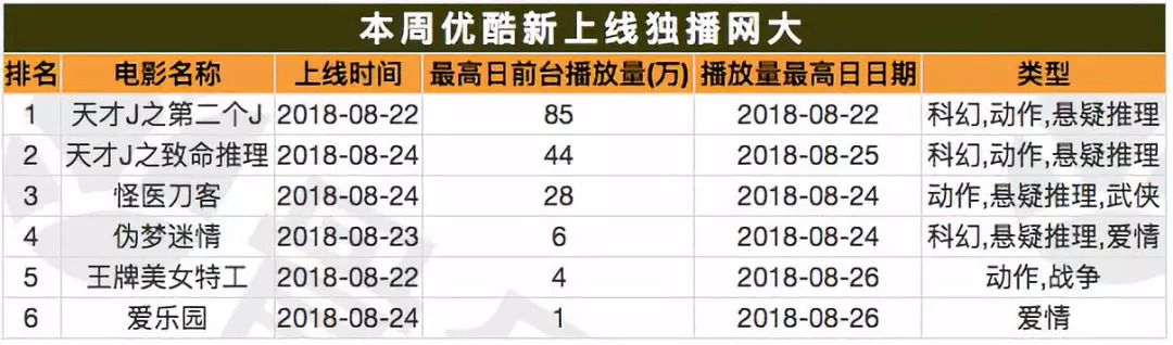 优酷本周上线6部独播网大,与上周持平,首日前台播放量166万,较上周减少65万。