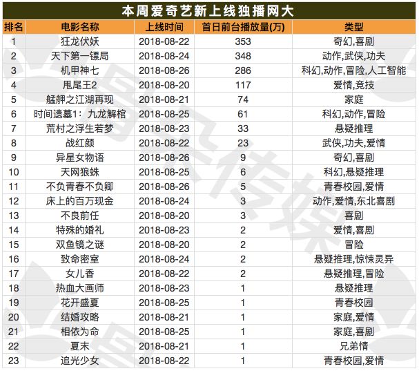 新上线独播网大首日前台播放量top10中,《狂龙伏妖》《天下第一镖局》《机甲神七》《甩尾王2》首日前台播放量均超100万。其中奇幻喜剧《狂龙伏妖》首日前台播放量达353万。