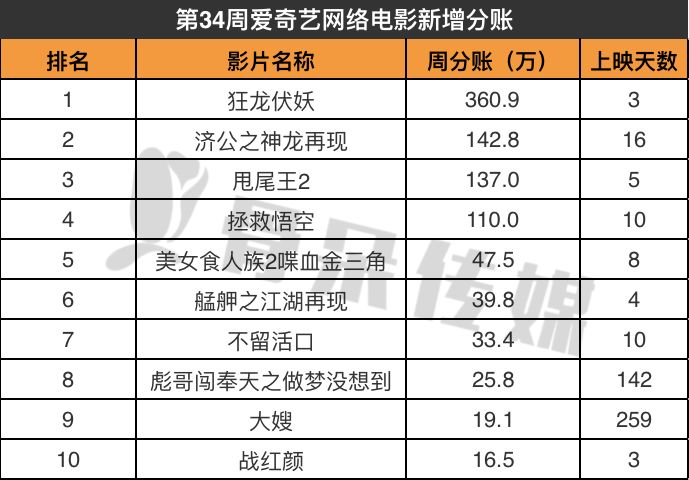 第34周爱奇艺网络电影新增分账中,《狂龙伏妖》《济公之神龙再现》《甩尾王2》分别以360.9万、142.8万、137万的票房分账占据前三甲。