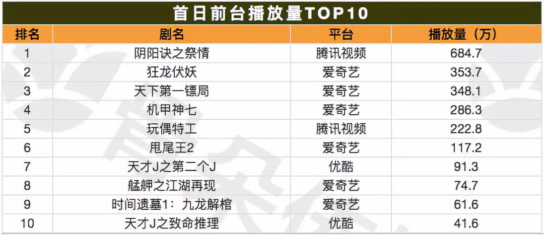 在首日前台播放量榜单中,腾讯视频入榜2部,优酷入榜2部,爱奇艺入榜6部。