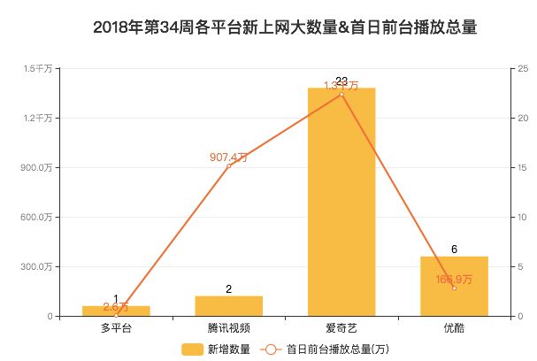 第34周各平台新上网大数量与首日前台总播放量中,爱奇艺新上网大数量最多,前台播放量上,爱奇艺首日前台播放量居首位。
