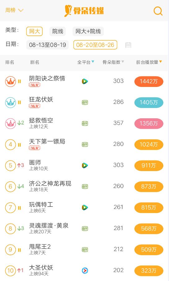 同样来自爱奇艺平台的《拯救悟空》,以1356万的周播放量排名第三,较上周3233万的top1周播放量有所下降。