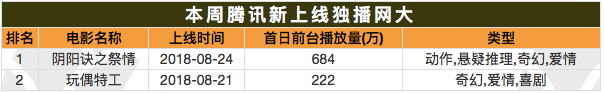 腾讯视频本周上新2部网大作品,分别为《阴阳诀之祭情》和《玩偶特工》,首日前台播放量均不俗。
