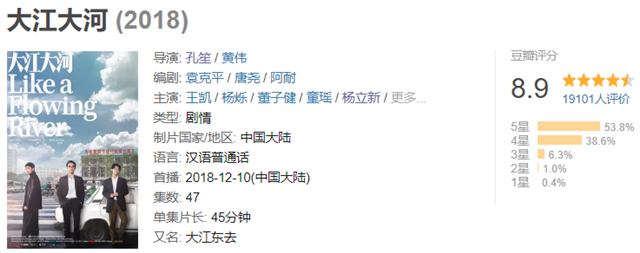 7、《大江大河》:豆瓣(8.9)分——目前才播出10几集,如果后续依然保持这种节奏,将宋运辉这个角色再按照原著小说中尽力挖掘的话,分数有可能还会上升。小说内容量比较大,所以电视剧跳跃的比较快,建议大家也可以看看小说。