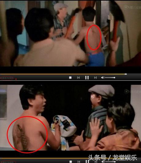 《癫凤狂龙》里面第1小时零8分30秒,陈百祥后背没纹身,到了1小时零8分32秒,后背又有纹身。
