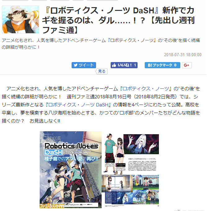根据最新一期日本游戏杂志fami通的速报,5pb公司开发制作的游戏新作《机器人笔记dash》确定将于2018年11月22日发售,登陆索尼ps4和任天堂switch平台。新作为《机器人笔记》的续作,故事背景设定在2020年,讲述包括主角八汐海翔以及其他机器人社成员从高中毕业后的故事,《命运石之门》中的“技术宅”桥田至也将在本作中登场。