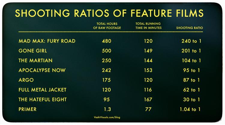 以外国电影举例,数字摄影的《疯狂的麦克斯4》和《消失的爱人》的耗片比达到了惊人的200:1以上。意味着每200分钟素材才能剪出1分钟成片。据说大卫·芬奇每场戏都要反复拍摄数十遍。相比之下,胶片拍摄的《八恶人》就少了很多。即使如库布里克这样苛刻的导演,耗片比也不会突破100:1。超低制作成本的《雷管》耗片比接近1:1,堪称楷模。